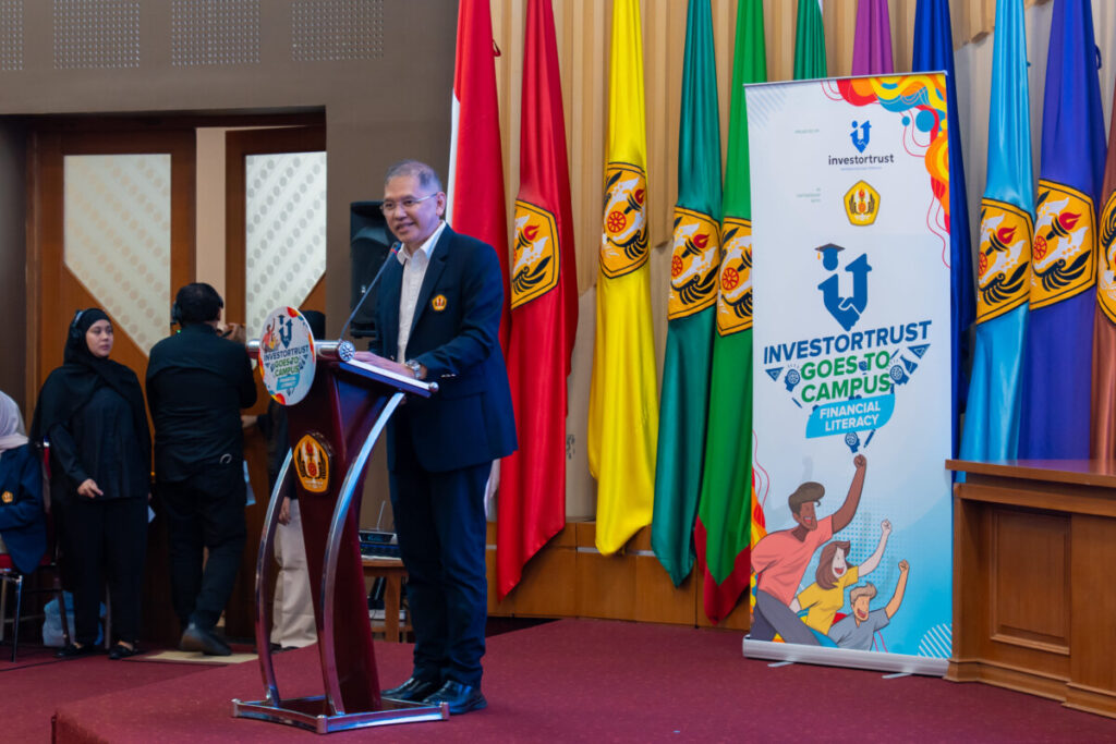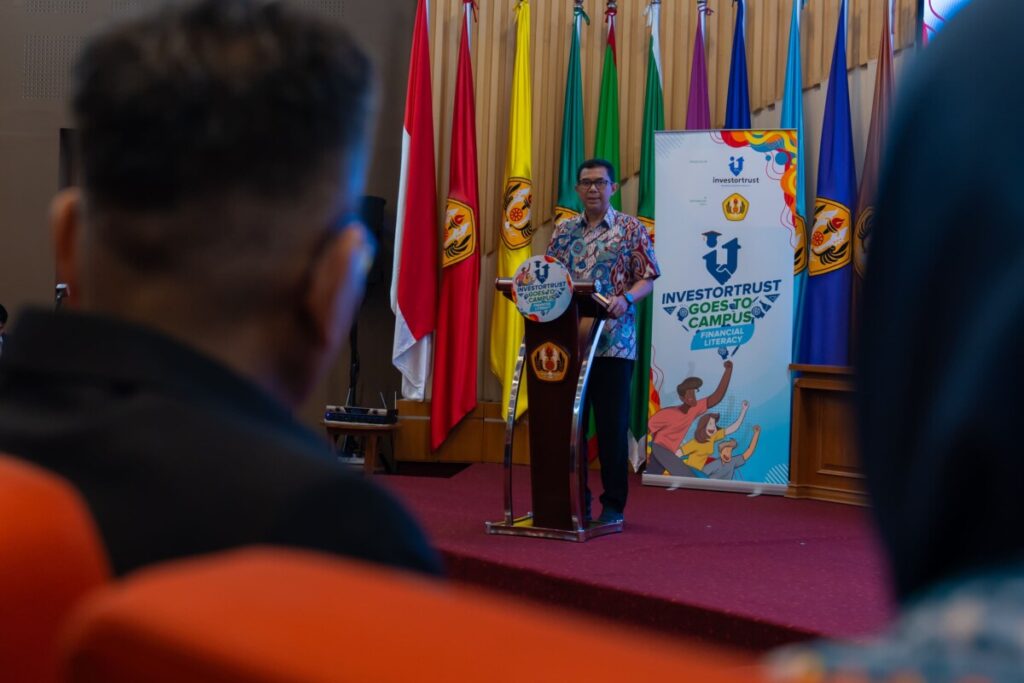 Prof. Arief Sjamsulaksan Kartasasmita, dr.,Sp.M(K).,M.Kes.,Ph.D, Rektor Unpad, dalam sambutannya menyampaikan pentingnya literasi keuangan bagi mahasiswa, “Memang kelihatannya mengenai literasi keuangan, bahkan sekarang literasi crypto dan juga investasi, ini merupakan hal yang sangat penting yang harus kita pahami bersama. Karena kita tahu sekarang begitu banyaknya produk keuangan, begitu banyaknya masalah-masalah keuangan yang kalau kita tidak pelajari secara baik, kalau kita tidak kenal, maka ini akan menyebabkan hal-hal yang menjadi permasalahan di masa yang akan datang, Oleh karenanya, saya berterima kasih kepada OJK, kepada Pintu, Investortrust dan seterusnya, untuk bisa memberikan sharing mengenai hal tersebut kepada kita semua di Unpad. Mudah-mudahan hal ini dapat menjadi hal yang bermanfaat untuk kita mempersiapkan masa depan yang lebih baik,”