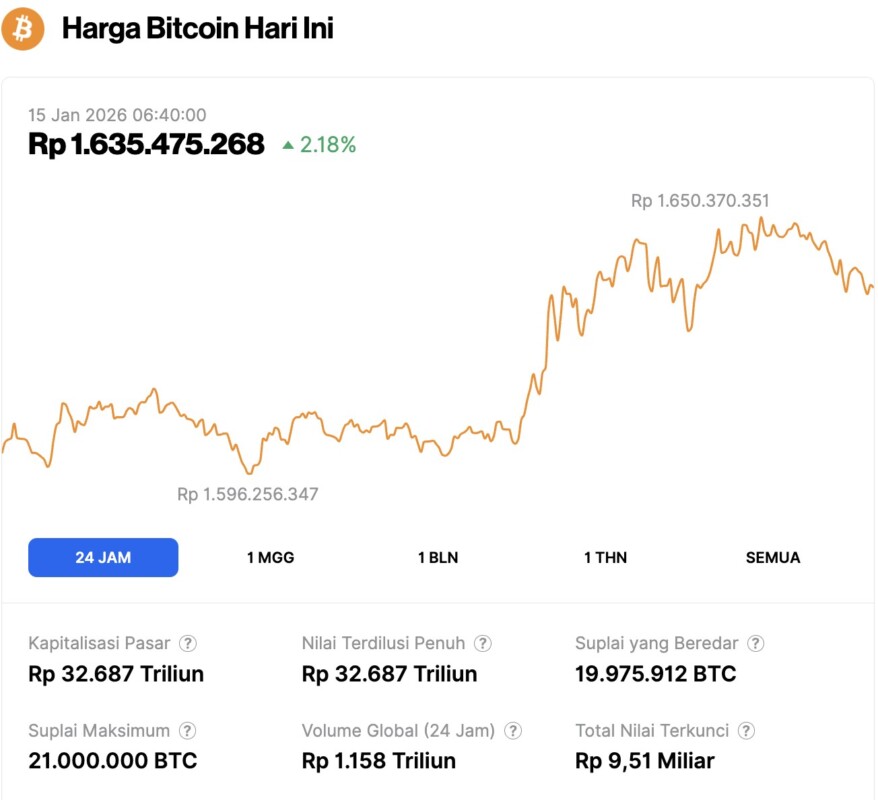On January 15, 2026, Bitcoin was trading at $97,060, equivalent to IDR 1,635,475,268 — a 2.18% increase over the past 24 hours. During this period, BTC reached a low of IDR 1,596,256,347 and a high of IDR 1,650,370,351.