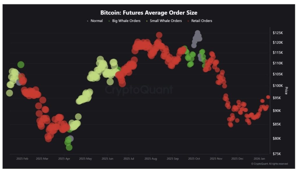 Data from CryptoQuant’s Futures Average Order Size chart shows a clear pattern. Large order sizes – usually associated with whales and institutions – have increased as Bitcoin’s price has risen from the $85,000 range to above $95,000.
