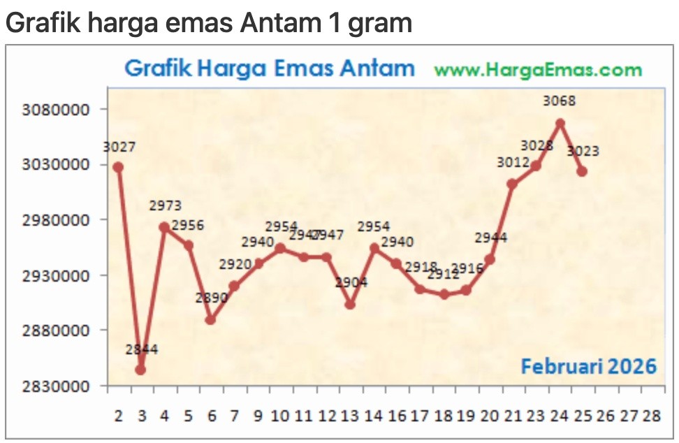 The price of gold bars produced by Antam for 1 gram is currently at the level of Rp3,023,000 based on the latest chart data for February. This figure shows a slight correction after previously touching a record high of IDR 3,068,000 on the previous trading day. You need to pay attention to this fluctuation as part of the market dynamics that naturally occur after gold has experienced a long and significant rally.