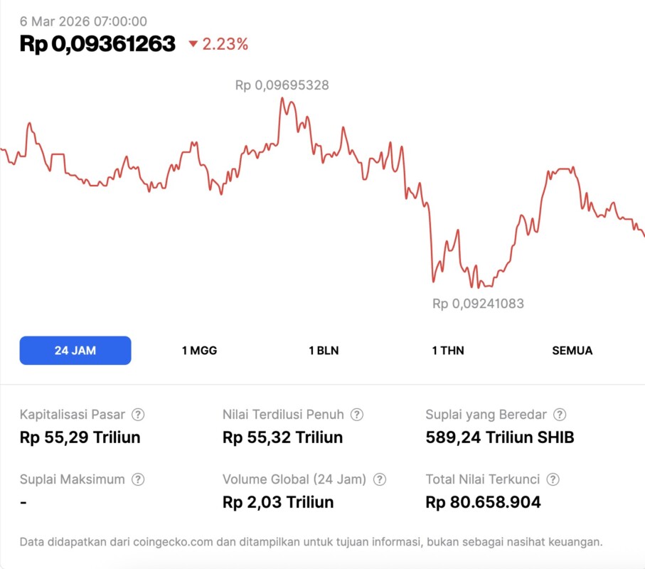 If converted, the price of $0.00000564 is equivalent to about Rp0.095 per SHIB. This minuscule amount of rupiah per token also explains why the percentage movement appears large despite the slight nominal change. For novice crypto investors, a more relevant focus is usually on the percentage change and liquidity, rather than the rupiah per token alone.