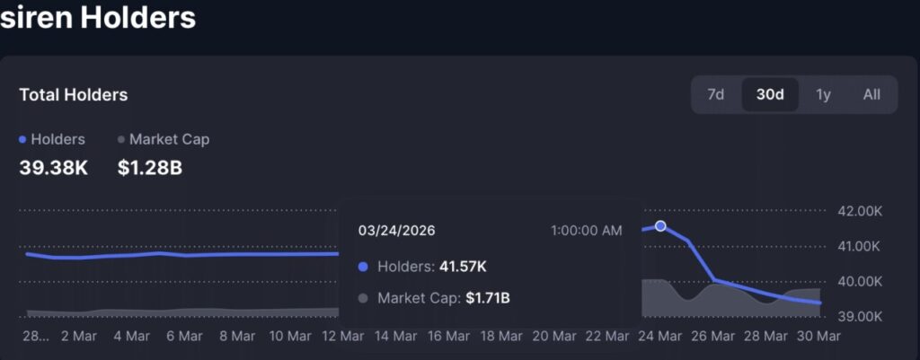 Siren (SIREN) recorded a remarkable price increase, including an additional approximately 11% in the last 24 hours. However, on the other hand, the number of holders actually decreased after peaking at 41,570 addresses. In a short period of time, the number of holders dropped by about 2,200 to 39,390.