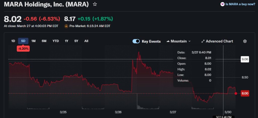 Marathon Digital (MARA) experienced a decline of 6.53% and closed at $8.02. Investors are now awaiting the company’s quarterly financial report to assess its fundamental performance.