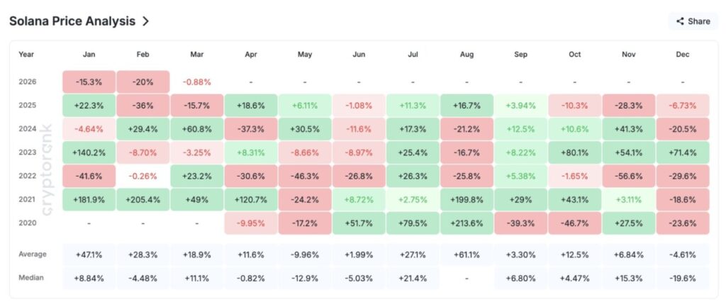 The monthly yield chart shows that Solana prices have not recorded a single green month since September 2025. In January 2026, SOL closed down 15.3%, then fell another 20% in February, while March is expected to end in the red with a decline of around 0.88%.