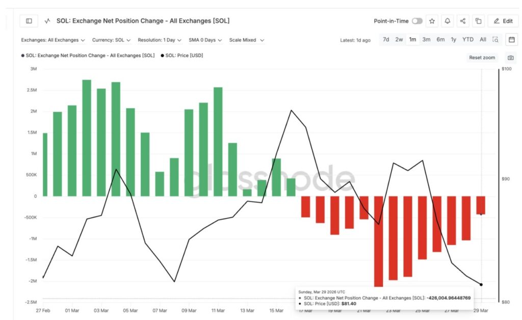 On-chain data shows that the buying pressure that had sustained SOL until mid-March started to dissipate ahead of April. Exchange net position change, a metric that measures the inflow and outflow of tokens from exchanges, previously reflected strong accumulation in the period from March 17 to 22, with a low of around -2,180,253 SOL. This negative number signifies tokens exiting the exchange, which is generally seen as a buying signal in the spot market.