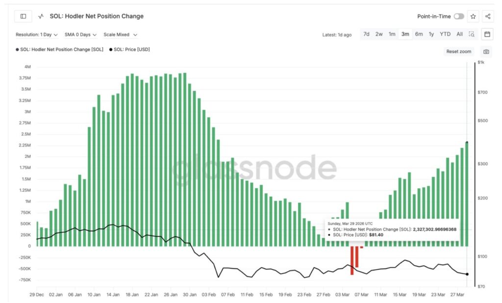 One metric that slightly held back the bearish scenario was the accumulation of long-term holders. The value of hodler net position change increased from 523,624 SOL on March 8 to 2,327,302 SOL on March 29, more than quadrupling. This suggests that mid- to long-term players are aggressively adding to their holdings, potentially creating a psychological floor for short-term holders considering selling.