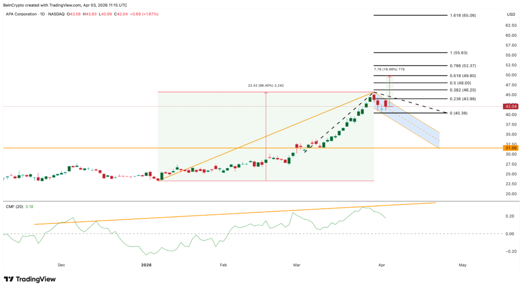 APA Corporation (APA) has been one of the stocks that has benefited the most from the rise in global oil prices. As an oil exploration and production company, rising commodity prices directly impact earnings. Since the beginning of January 2026, APA stock has surged by about 96%, reflecting a strong bullish sentiment. The technical pattern shows the formation of a bull flag, indicating a potential continuation of the uptrend.