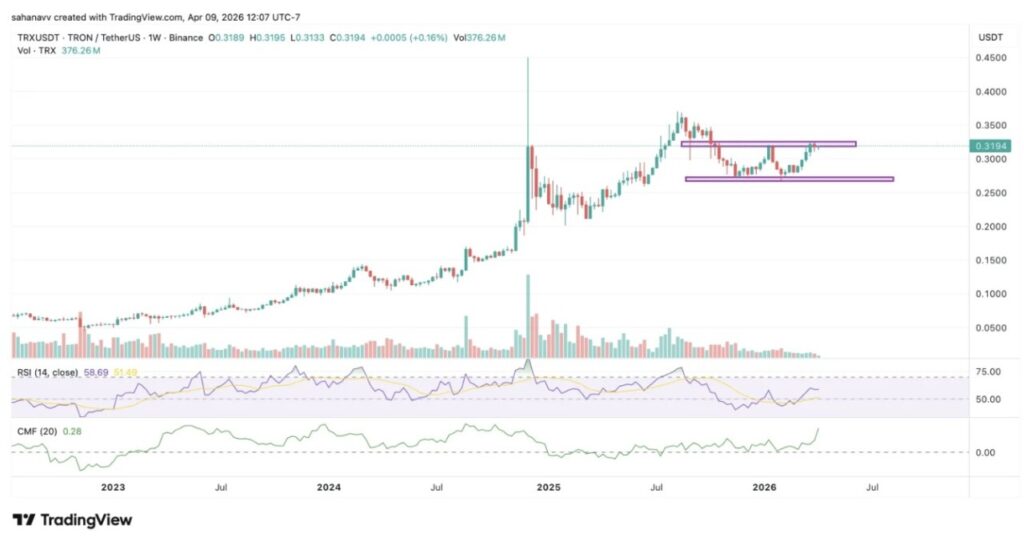 As seen in the previous chart, the price of TRX in the weekly time frame is still stuck within the support and resistance area while forming a double bottom pattern. Currently, the price is trying to hold in the resistance area. If this level is able to be maintained, the increase in the CMF indicator which indicates an influx of liquidity could open up opportunities for a breakout.