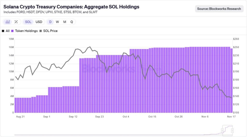 Institusi besar, termasuk 20+ DAT dan 2 ETF, telah mengakumulasi lebih dari 24 juta SOL meskipun harga sedang dalam tren turun.