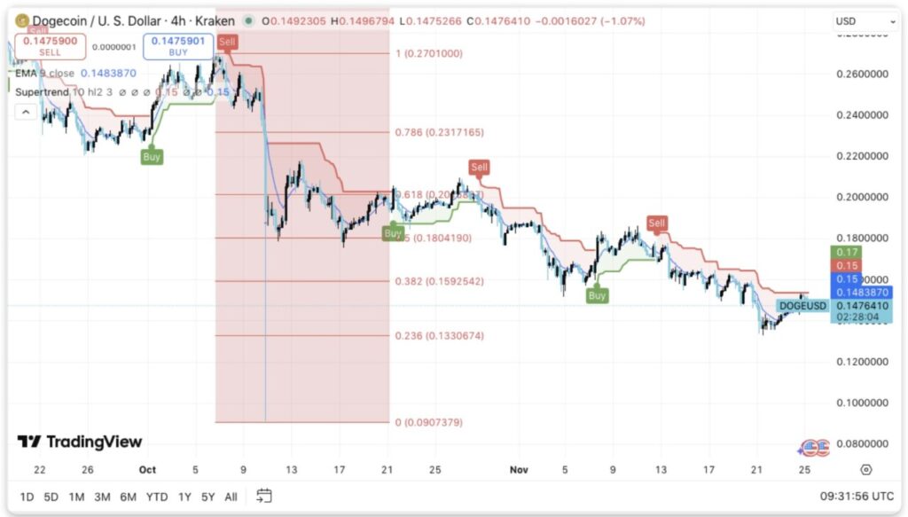 Dogecoin masih berada dalam tren penurunan yang jelas jika dilihat dari grafik 4 jam. Harga terus membentuk lower high, dan setiap upaya pemantulan selalu tertahan di pita merah Supertrend. Saat ini, Dogecoin diperdagangkan di kisaran $0,147 setelah gagal mempertahankan posisi di atas $0,150.