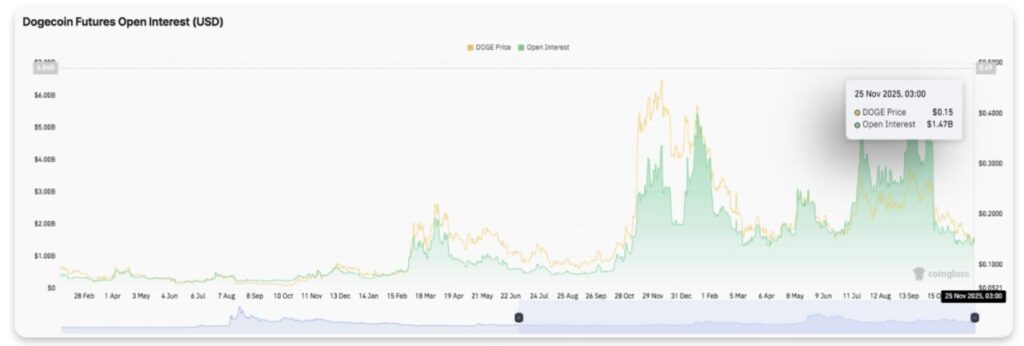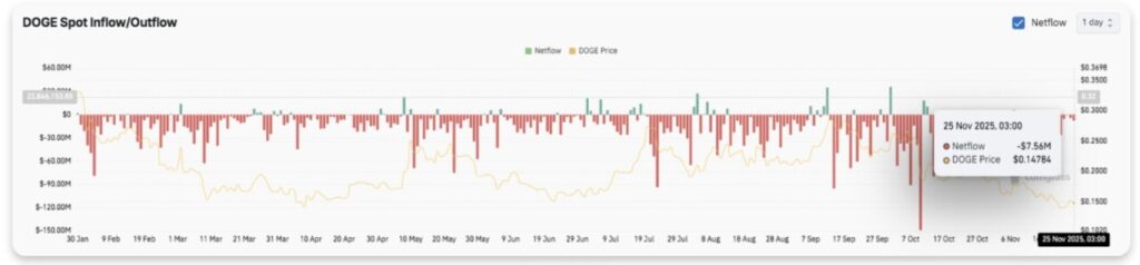 Pembacaan terbaru pada 25 November mencatat arus keluar sebesar $7,56 juta, saat Dogecoin diperdagangkan di sekitar $0,148. Aktivitas ini menunjukkan bahwa para pembeli masih bersikap hati-hati dan lebih memilih mengurangi eksposur di tengah ketidakpastian pasar.