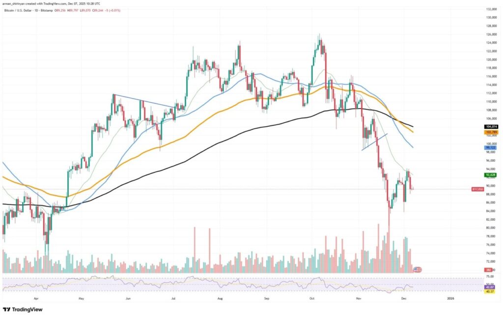 Bitcoin masih diperdagangkan di bawah rata-rata pergerakan utamanya setelah penjualan besar-besaran terakhir. Struktur ini, menurut analisis teknikal, menunjukkan bahwa pasar masih berada dalam fase pemulihan yang mendukung pandangan awal Burry tentang risiko koreksi.