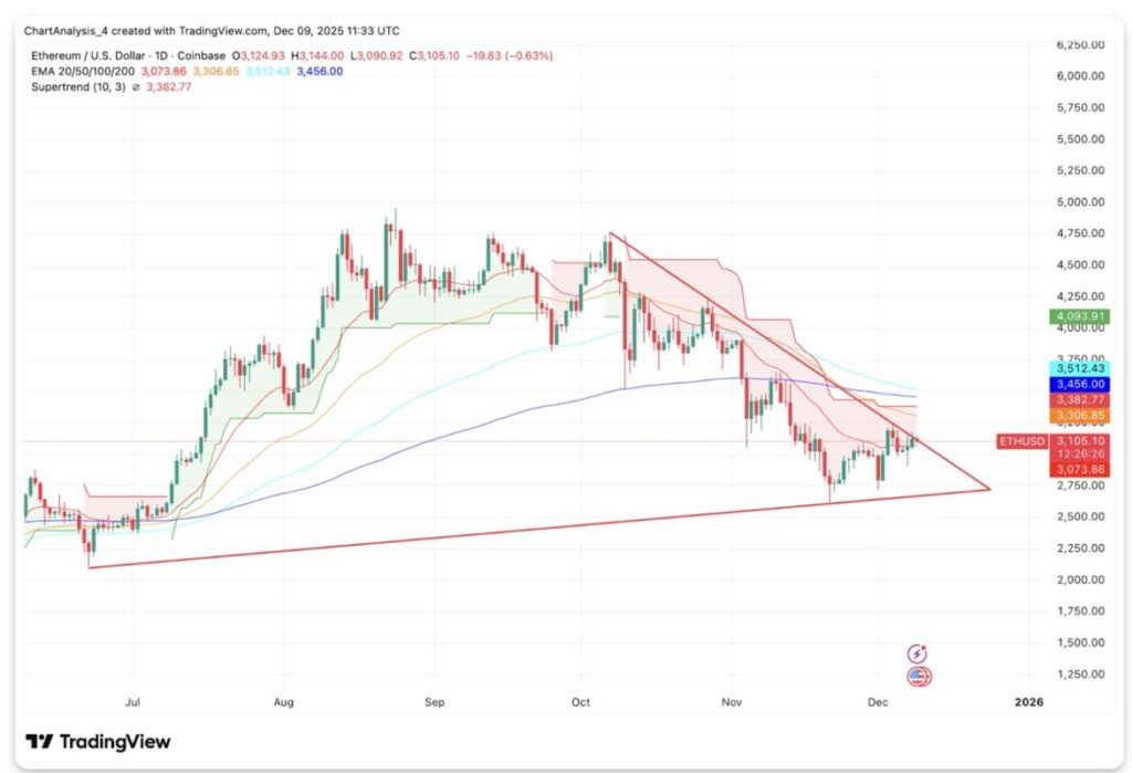 Jakarta, Pintu News – Harga Ethereum sempat diperdagangkan di kisaran $3.105 pada 9 Desember, bergerak dalam pola segitiga menyempit yang telah membentuk arah pergerakan sejak Juli. Pasar kini berada tepat di titik pertemuan (apex) pola tersebut, dan pergerakan selanjutnya diprediksi akan menjadi sangat menentukan.