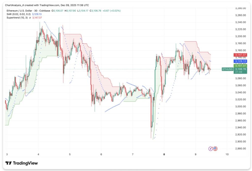 Pada grafik 30 menit (9/12), Ethereum tampak kesulitan menembus resistance Supertrend di $3.147, dengan beberapa kali gagal membangun momentum naik. Indikator Parabolic SAR juga kembali berbalik ke arah bearish, menandakan hilangnya kendali jangka pendek dari pihak pembeli. Ini sejalan dengan tema yang lebih luas, yaitu keraguan pasar menjelang breakout besar.