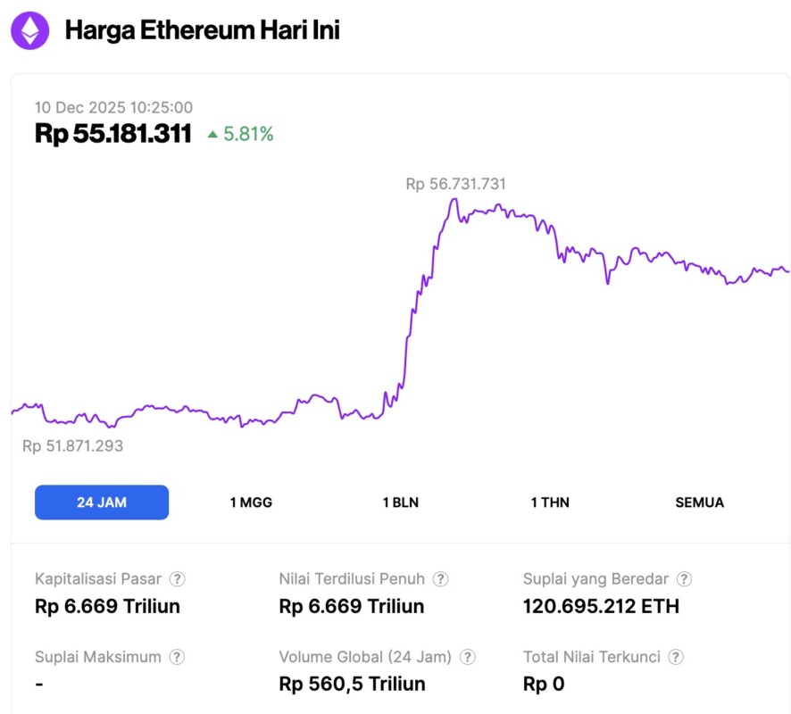 Pada 10 Desember 2025, harga Ethereum tercatat berada di sekitar $3,306 atau setara dengan Rp55.181.311, mengalami kenaikan 5,81% dalam 24 jam terakhir. Sepanjang periode ini, ETH sempat menyentuh level terendahnya di Rp51.871.293 dan level tertingginya di Rp56.731.731.