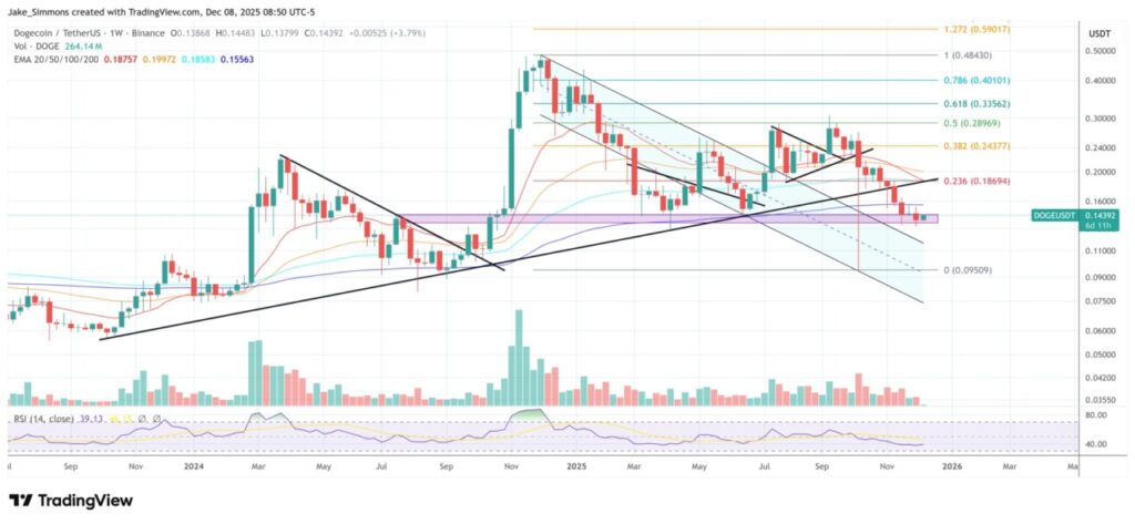 Dogecoin telah kehilangan garis tren hitam naik yang sebelumnya menghubungkan titik-titik terendah yang lebih tinggi dari sisi kiri grafik. Kehilangan ini menandakan bahwa pembeli mungkin kehilangan kendali, namun posisi saat ini masih bisa diinterpretasikan sebagai zona bottoming jangka panjang daripada keruntuhan yang sudah selesai.