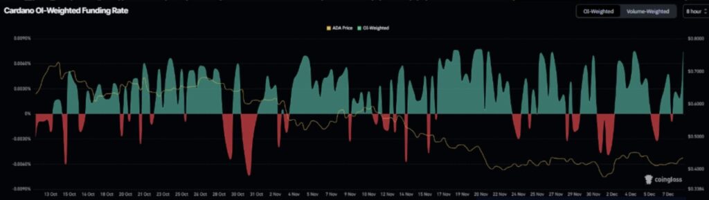 Data dari Coinglass OI-Weighted Funding Rate menunjukkan bahwa jumlah trader yang memperkirakan penurunan harga semakin berkurang, sementara semakin banyak yang memprediksi kenaikan nilai ADA. Pergerakan ini menjadi sinyal kuat bahwa tren bullish Cardano mungkin sedang terbentuk.