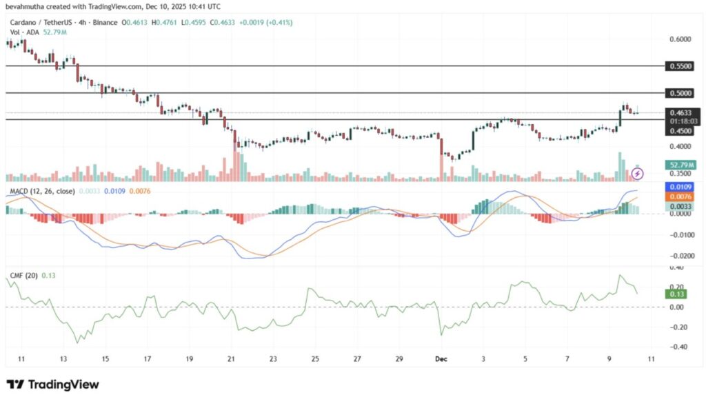 Pada grafik 4 jam (10/12), terlihat bahwa ADA berhasil menembus level resistance penting di $0,47, yang menjadi sinyal positif untuk potensi keuntungan tambahan.