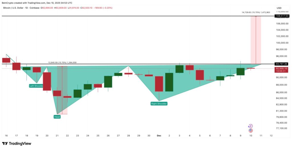 Jakarta, Pintu News – Harga Bitcoin naik 2,8% ke sekitar $92.500, tetapi masih gagal menembus target teknik $108.500 meski pola inverse head and shoulders sudah terbentuk. Dua hambatan utama menghalangi breakout ini, namun keduanya masih dapat diatasi.