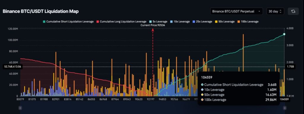 Walau whale absen, data Binance menunjukkan leverage short 30 hari terakhir mencapai $3,66 miliar — hampir 50% lebih tinggi daripada posisi long. Ketidakseimbangan ini menciptakan peluang short squeeze. Jika BTC mendorong secara meyakinkan di atas $93.700, likuidasi short dapat memicu lonjakan cepat menuju $94.600 dan membuka ruang kenaikan lebih besar tanpa bantuan whale.