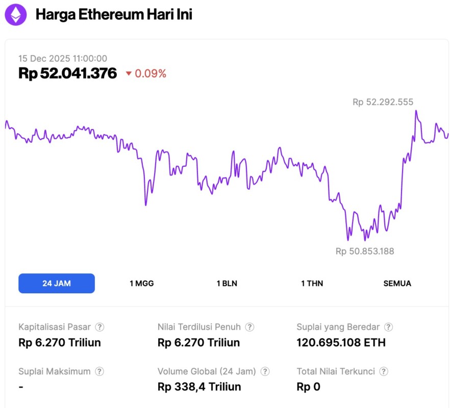 Pada 15 Desember 2025, harga Ethereum tercatat berada di sekitar $3,113 atau setara dengan Rp52.041.376, mengalami penurunan tipis 0,09% dalam 24 jam terakhir. Sepanjang periode ini, ETH sempat menyentuh level terendahnya di Rp50.853.188 dan level tertingginya di Rp52.292.555.