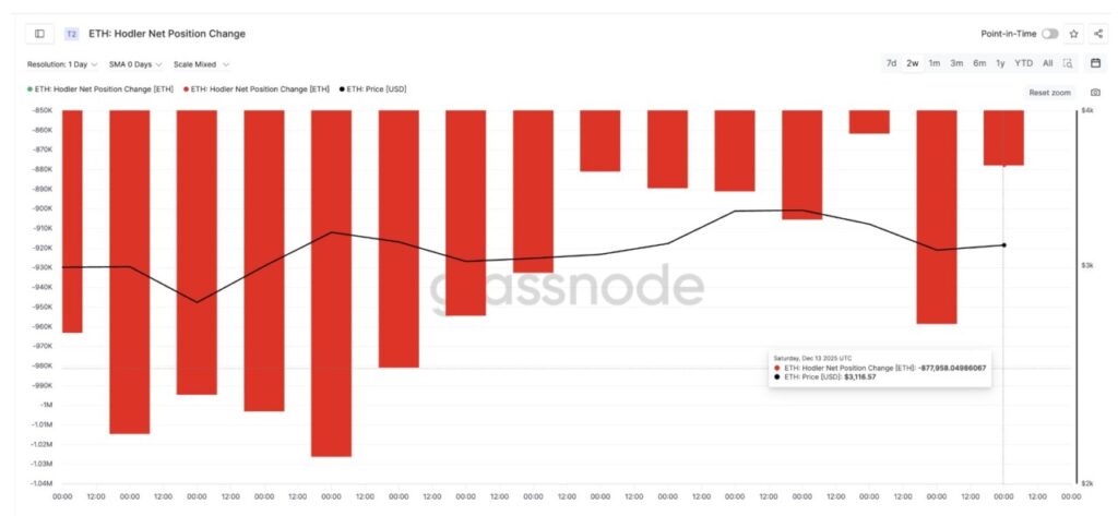 Pada 12 Desember, para pemegang Ethereum mendistribusikan sekitar 958.771 ETH. Namun pada 13 Desember, angka penjualan bersih turun menjadi sekitar 877.958 ETH, menandai penurunan tekanan jual sekitar 8,4% hanya dalam 24 jam.