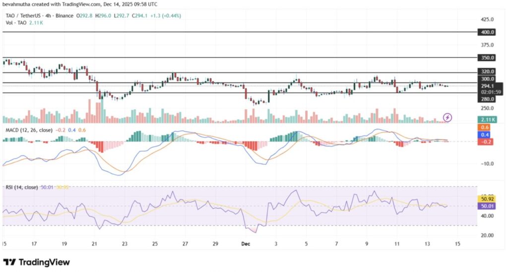 Pada 13 Desember, harga TAO sempat berada di angka $293, naik tipis sebesar 0,27%. Selama beberapa waktu terakhir, harga TAO bergerak dalam kisaran $280 hingga $320, menunjukkan fase konsolidasi.