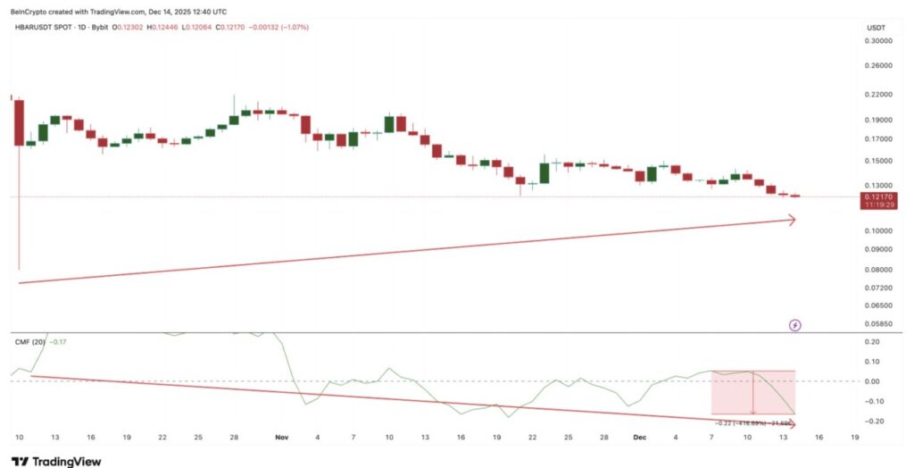 Sumber utama tekanan terhadap Hedera berasal dari perilaku pemegang besar (whale) yang mulai menarik diri. Hal ini terlihat melalui indikator Chaikin Money Flow (CMF), yang mengukur apakah dana besar sedang masuk atau keluar dari suatu aset dengan menggabungkan pergerakan harga dan volume perdagangan.