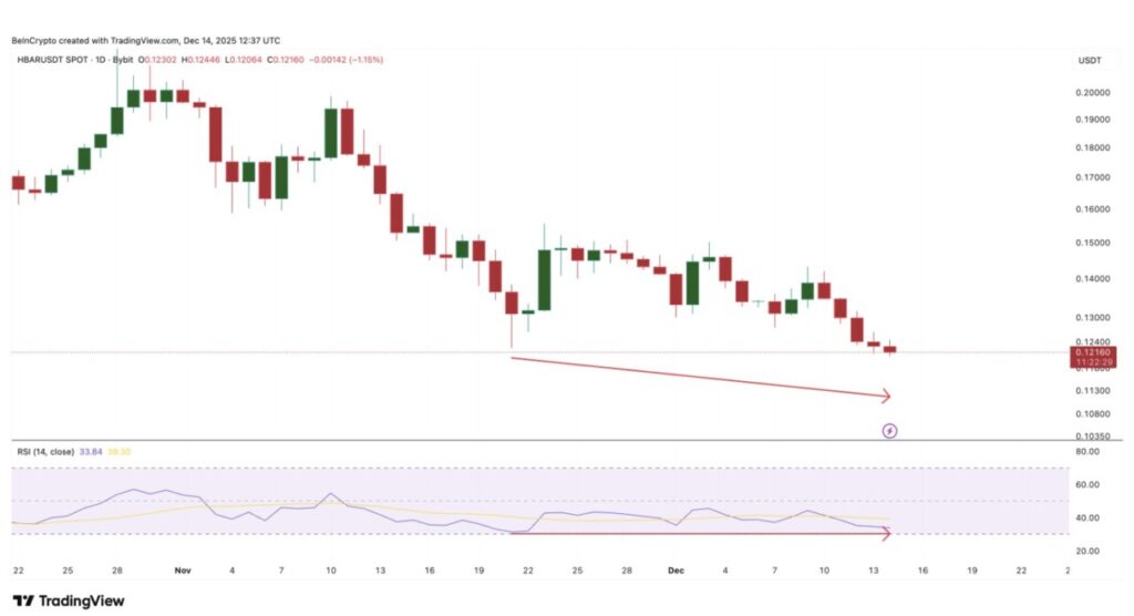 Jakarta, Pintu News – Dilansir dari BeInCrypto (14/12), HBAR mulai menunjukkan tanda-tanda melemah. Token ini turun hampir 2% dalam 24 jam dan mendekati penurunan 10% dalam sepekan. Sepanjang penurunan ini, harga HBAR telah menembus beberapa level support jangka pendek dan kini berada di kisaran $0,12.