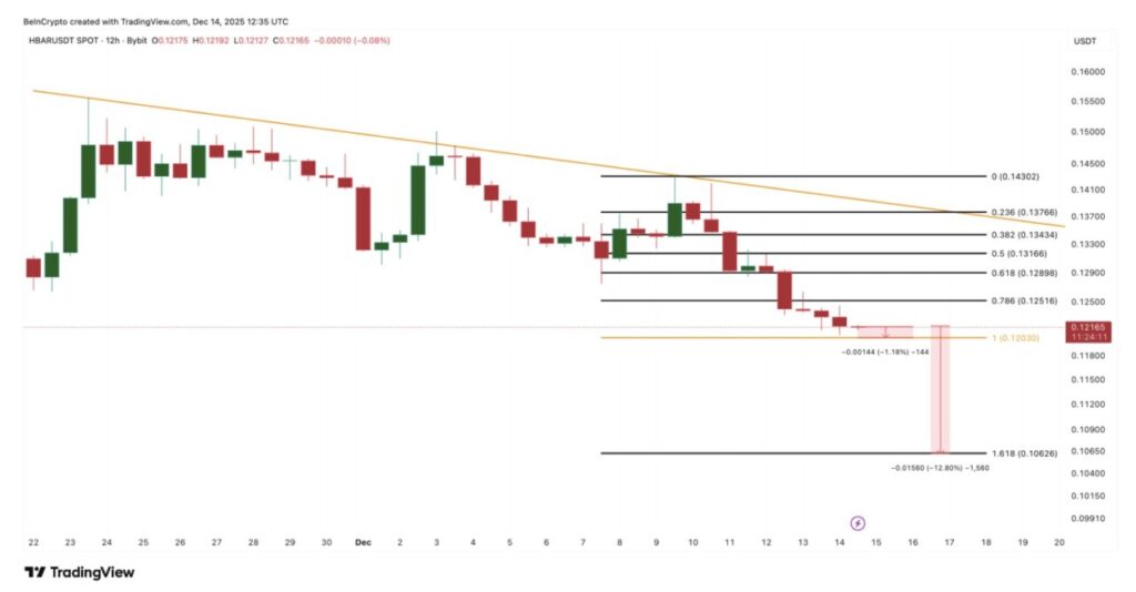 Arah pergerakan harga akan menentukan hasil akhirnya. Saat ini, HBAR diperdagangkan di bawah garis tren menurun (descending trendline) yang telah menahan setiap reli selama beberapa minggu terakhir. Di saat yang sama, harga sedang menguji support berbasis Fibonacci di sekitar $0,12.