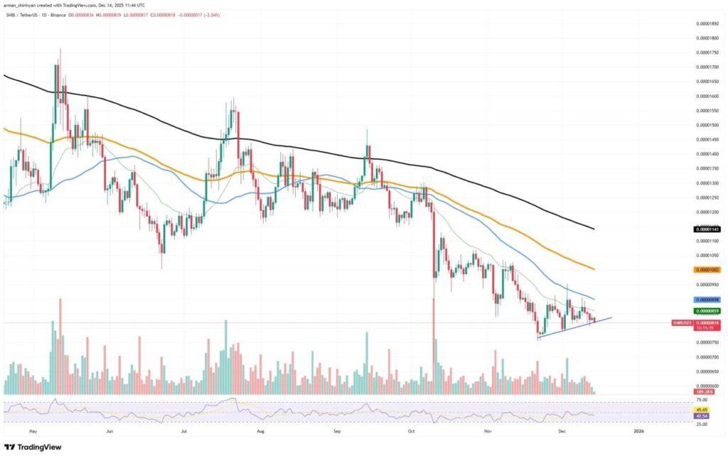 Dari segi teknis, SHIB masih berada di bawah semua moving average utama, dengan moving average 200 hari yang masih berfungsi sebagai resistensi. Tren jangka panjang masih negatif, dan setiap upaya kenaikan harga selalu terhenti pada titik yang lebih rendah, menunjukkan bahwa penjual masih mendominasi.