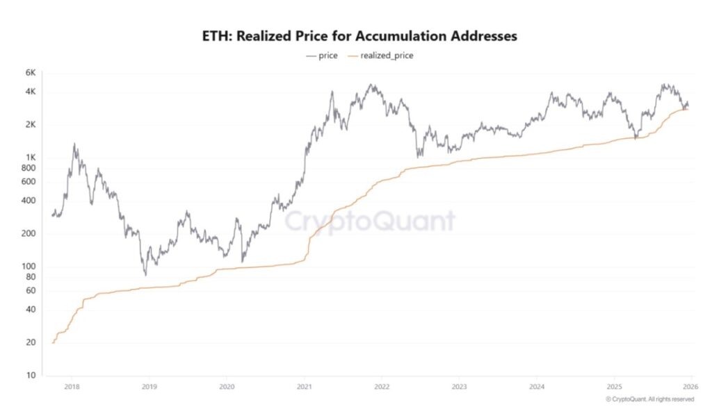 Salah satu perkembangan paling mencolok pada grafik harga Ethereum berasal dari data harga realisasi yang terkait dengan alamat akumulasi. Berdasarkan grafik metrik on-chain dari CryptoQuant, pemegang besar (whale) secara konsisten telah menaikkan biaya dasar kepemilikan mereka selama beberapa bulan terakhir.