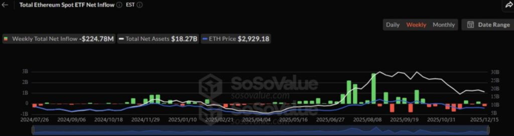 Selain data on-chain, aktivitas di sektor ETF juga memberikan lapisan konfirmasi tambahan. Sepanjang tahun ini, ETF Ethereum mencatat lebih banyak minggu dengan arus masuk dibanding arus keluar. Konsistensi ini menunjukkan bahwa partisipasi institusional terus menopang pasar, bahkan di tengah periode ketidakpastian yang lebih luas.