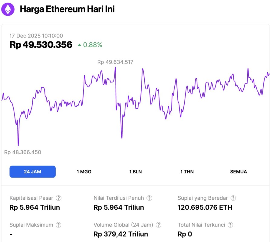 Pada 17 Desember 2025, harga Ethereum tercatat berada di sekitar $2,959 atau setara dengan Rp49.530.356, mengalami kenaikan tipis 0,88% dalam 24 jam terakhir. Sepanjang periode ini, ETH sempat menyentuh level terendahnya di Rp48.366.450 dan level tertingginya di Rp49.634.517.