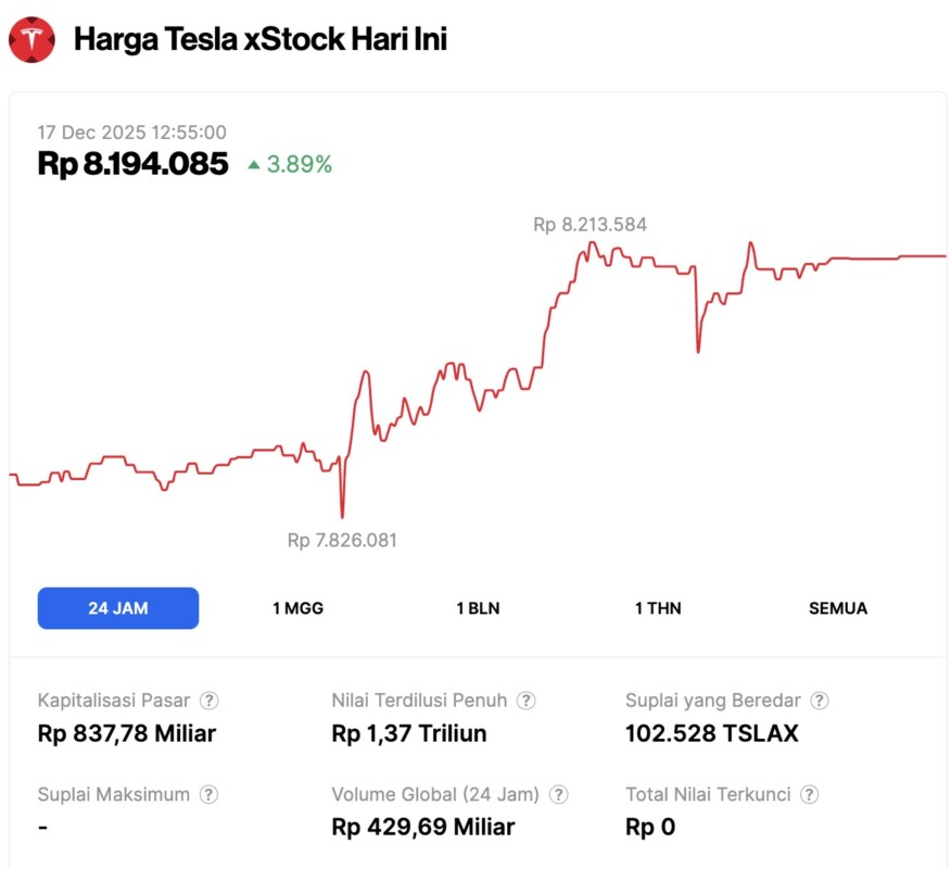 Pada saat penulisan (17/12), harga token saham Tesla kini berada di sekitar Rp8.194.085 (sekitar $489.88), mencatat kenaikan 3,89% dalam periode waktu 24 jam terakhir.