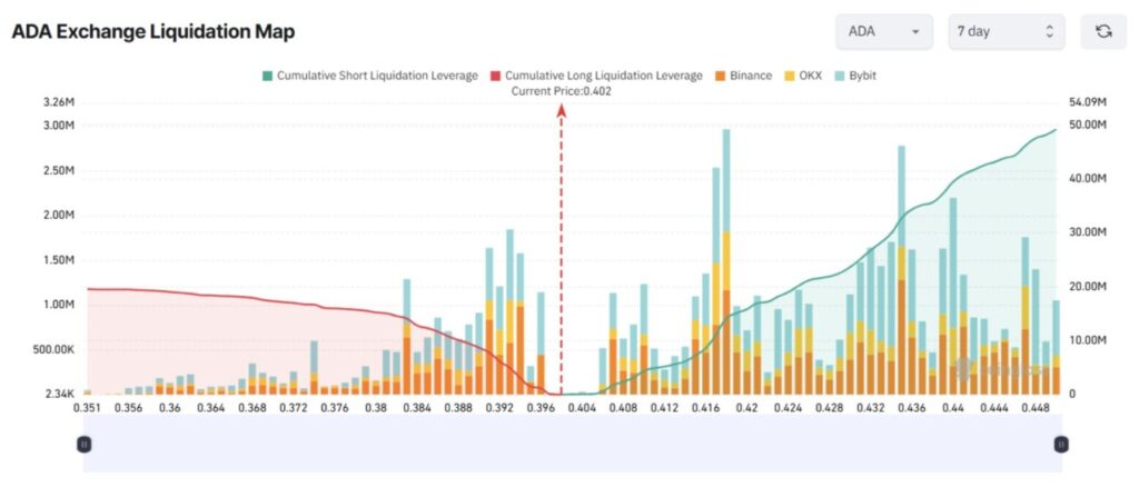 Perilaku ini menyebabkan lonjakan signifikan dalam potensi volume likuidasi posisi short. Jika harga ADA naik ke $0,45 minggu ini, posisi short dapat mengalami kerugian hingga $50 juta. Sebaliknya, jika harga turun ke $0,35, posisi long (beli) berisiko terkena likuidasi sekitar $19,5 juta.