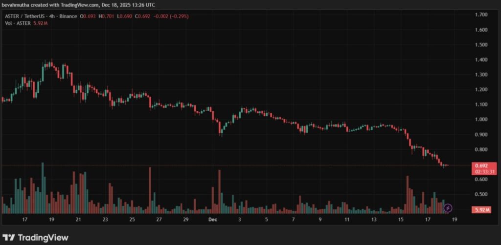 Harga Aster turun 7,7% pada 18 Desember 2025, melampaui kinerja pasar kripto yang lebih luas, yang turun 0,7%. Saat ini, harga diperdagangkan di $0,6925. Koin-koin utama seperti Bitcoin, Ethereum, XRP, dan BNB juga berisiko mengalami penurunan lebih lanjut.