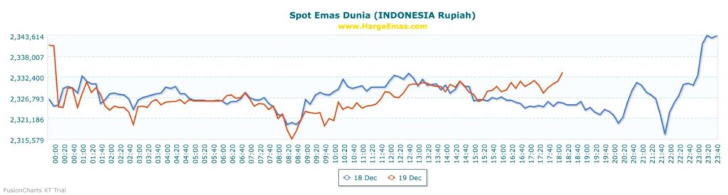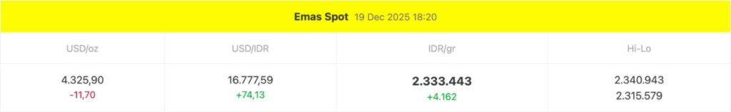 Melihat pergerakan harga emas global, harga emas spot pada 19 Desember 2025 tercatat sebesar $4.325,90 per ons, meskipun mengalami penurunan sebesar $11,70. Namun, penguatan nilai tukar Rupiah terhadap dolar Amerika Serikat menyebabkan harga emas dalam Rupiah sedikit mengalami koreksi dengan nilai IDR 2.333.443 per gram. Kenaikan harga emas yang signifikan ini turut mencatatkan angka-angka yang lebih tinggi dibandingkan dengan grafik pergerakan sebelumnya, yang terlihat di pasar domestik.