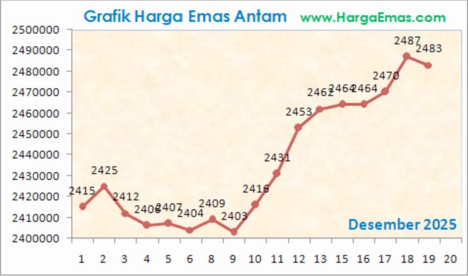 Berdasarkan grafik terbaru, harga emas Antam pada 19 Desember 2025 tercatat di kisaran Rp2.483.000āRp2.487.000 per gram, mencerminkan kenaikan dibandingkan awal bulan Desember.