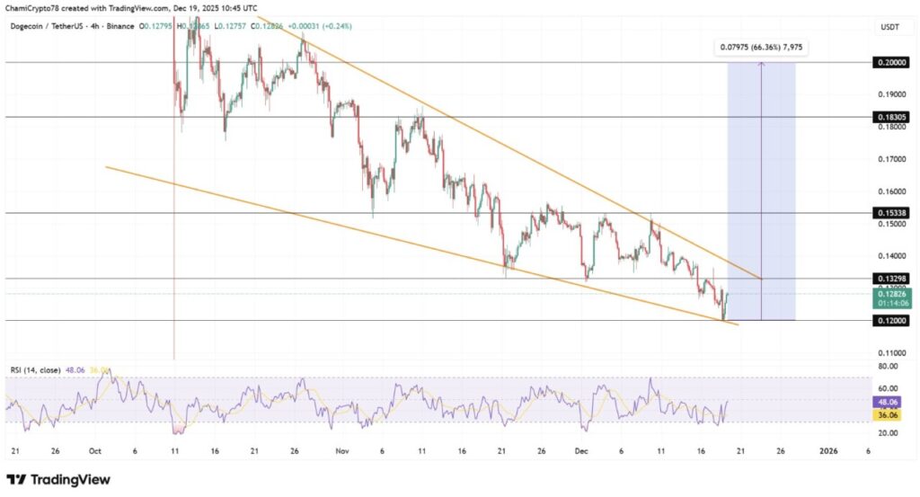 Harga Dogecoin masih diperdagangkan dalam pola wedge menurun seperti yang terlihat pada chart empat jam. Struktur ini mencerminkan kompresi yang terkontrol daripada penurunan yang tidak teratur. Permintaan telah merespons dengan baik baru-baru ini, karena harga mengalami pemulihan di batas bawah sekitar area $0,12.