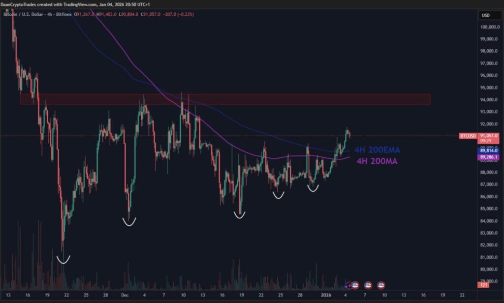 Selain itu, harga Bitcoin juga telah menembus di atas MA 200 dan EMA 200 pada grafik 4 jam, yang merupakan sinyal potensi tren naik dalam jangka pendek hingga menengah. Level utama yang perlu ditembus oleh pihak bullish saat ini tetap berada di area horizontal $94.000, yang juga merupakan batas atas dari rentang harga sebelumnya.