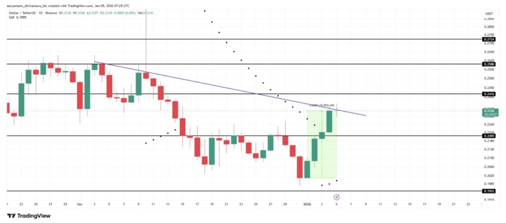 Pada 5 Januari 2026, XLM diperdagangkan di kisaran $0,233, mencatat kenaikan hampir 16% dalam tujuh hari terakhir.