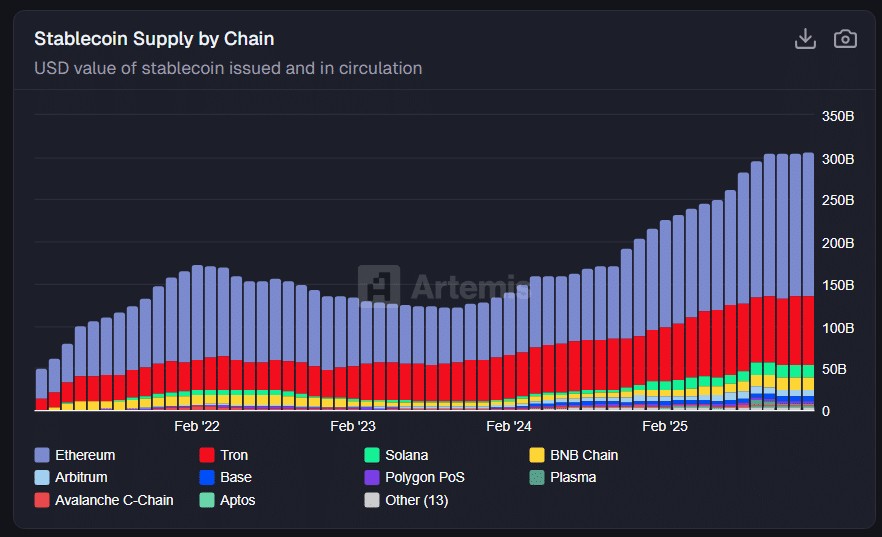 Solana , yang sebelumnya hanya memiliki porsi kecil dalam pasokan Stablecoin, kini mengalami peningkatan signifikan. Kenaikan ini sejalan dengan peningkatan volume perdagangan on-chain Solana, yang mencerminkan pergeseran preferensi pelaku pasar dari bursa terpusat ke pasar on-chain.