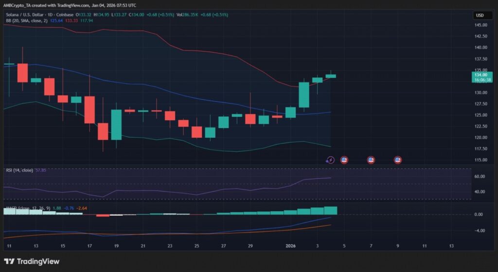 Setelah beberapa minggu konsolidasi, harga Solana (SOL) berhasil menembus kembali level $130. Peningkatan ini membantu Solana memulihkan posisinya setelah penurunan di akhir tahun. Gerakan harga ini menunjukkan adanya aktivitas investasi jangka panjang yang mungkin sedang dipersiapkan oleh para investor.