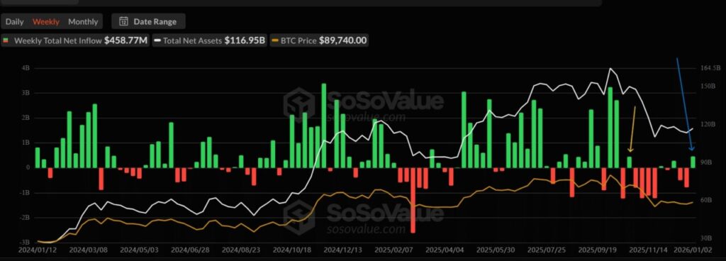 Pada tanggal 5 Januari, para whale termasuk Binance dan Coinbase telah membeli Bitcoin (BTC) senilai lebih dari $3,5 miliar dalam waktu hanya 10 jam. Hal ini menunjukkan minat institusional yang meningkat terhadap Bitcoin (BTC), terutama dengan masuknya dana ke ETF Bitcoin yang mencapai $458 juta minggu lalu.