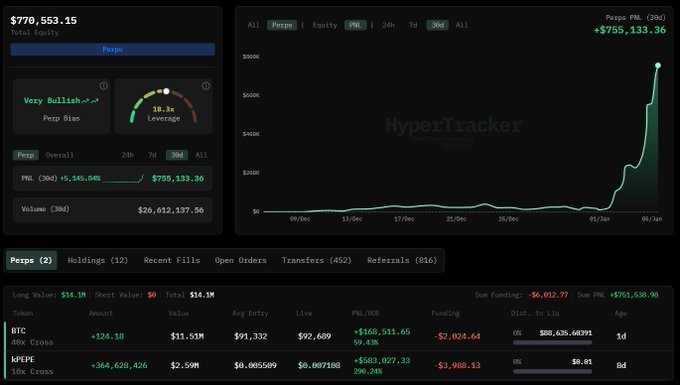 James Wynn, yang dikenal karena kinerja perdagangannya yang buruk pada tahun 2025, telah meningkatkan posisi long Bitcoin (BTC) nya menjadi $14 juta dengan leverage 40x. Saat ini, ia memiliki keuntungan mengambang lebih dari $750.000. Strategi berisiko ini bisa memberikan hasil yang besar atau kerugian yang signifikan jika pasar berbalik arah.