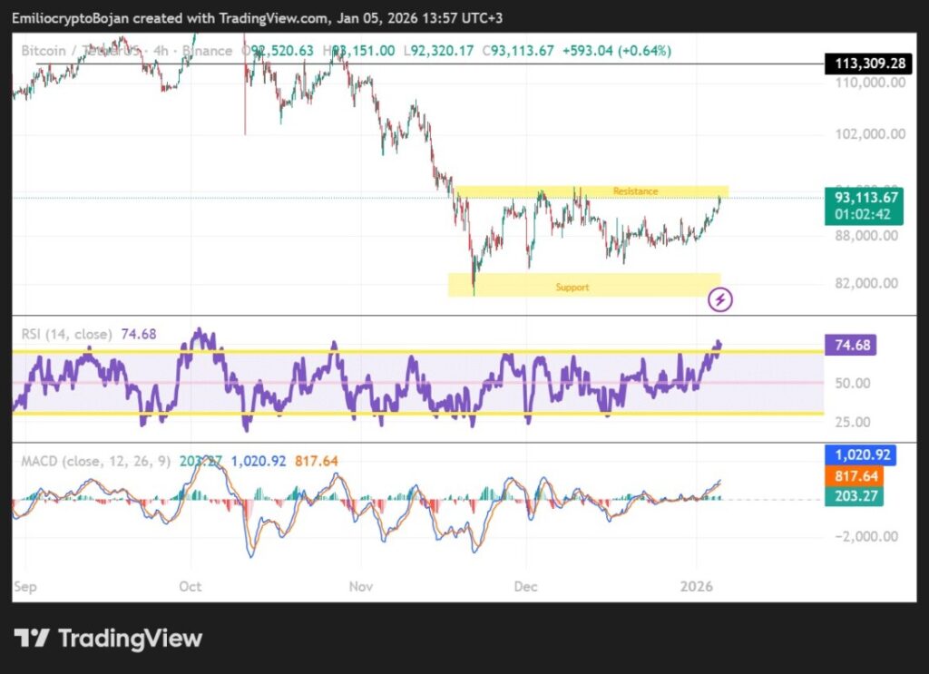 Bitcoin (BTC) baru-baru ini berhasil menembus level resistensi penting di $93.000. Namun, indikator RSI menunjukkan angka 74,68, yang menandakan kondisi overbought, sementara MACD menunjukkan momentum yang mulai melambat. Jika Bitcoin (BTC) gagal menembus resistensi ini lebih lanjut, koreksi ke level $90.000 mungkin terjadi.