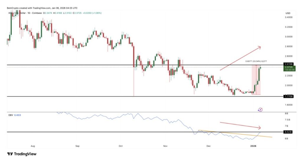 Inilah alasan mengapa harga XRP tertahan di sekitar $2,41 dan mengapa indikator OBV mulai mendatar sementara NUPL terus naik.