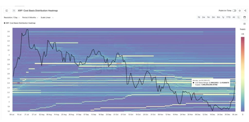 Peta panas distribusi cost-basis menunjukkan area ini sebagai klaster suplai utama. Cost basis menggambarkan di mana koin-koin sebelumnya dibeli. Di antara level $2,39 hingga $2,41, sekitar 1,56 miliar XRP telah diakumulasi.