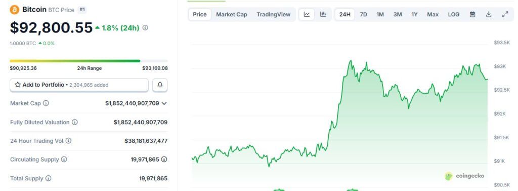 Jakarta, Pintu News – Harga Bitcoin kembali mencatatkan penguatan signifikan dengan menembus level US$92.000 di tengah meningkatnya ketegangan geopolitik setelah pernyataan Presiden Amerika Serikat Donald Trump terkait potensi tindakan terhadap Kolombia.